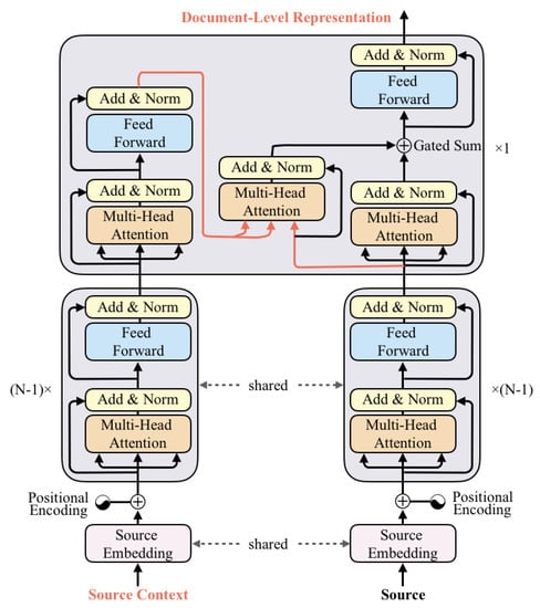 It aims to consider both the current sentence and its large context in a unified model to improve translation performances, especially discourse properties. Figure 5 introduces a classic document-level NMT model, namely multi-encoder [,,]. Taking [] for an example, it employs layers of context encoder to summarize the larger context from source-side previous sentences, and layers of a standard encoder to model the current sentence. At the last layer, they integrate the contextual information with the source representations using a gating mechanism. Finally, the combined document-level representations are fed into the NMT decoder to translate the current sentence.