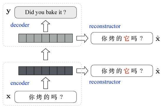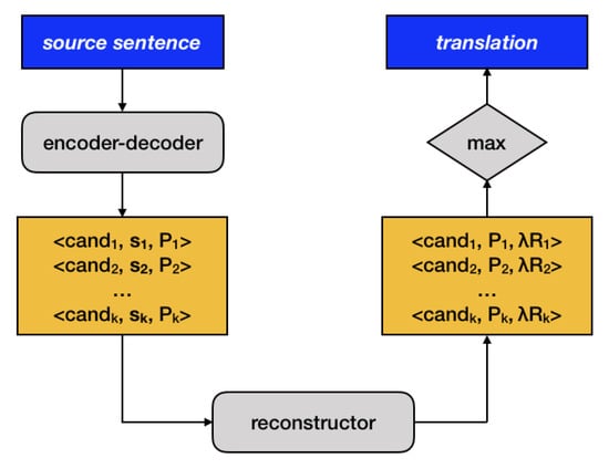 where the weight is calculated by an additional attention model. The parameters related to the attention model, , and , are independent of the standard NMT model. The labeled source words share the same word embeddings with the NMT encoder. Finally, they augment the standard encoder–decoder-based NMT model with the introduced reconstructor, as shown in Figure 6. The standard encoder–decoder reads the source sentence and outputs its translation along with the likelihood score.