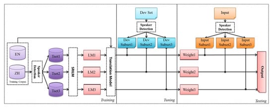 As shown in Figure 8, Ref. [] conduct a personalized MT experiment to explore the effects of speaker tags on dialogue MT. They first build a baseline MT engine using Moses [] on a dataset extracted from the bilingual movie subtitle of Friends. They train a 5-gram language model using the SRI Language Toolkit [] on the target side of the parallel corpus. Besides, they use GIZA++ [] for word alignment and minimum error rate training [] to optimize feature weights. Based on the hypothesis that different types of speakers may have specific speaking styles, they employ a language model adaptation method to boost the MT system. Instead of building a LM on the whole data, they split the data into two separate parts according to the speakers’ sex and then build two separate LMs. As Moses supports multiple LM integration, they directly feed Moses two LMs.