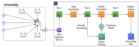 Diagram of the proposed strategy for users’ profile identification and load forecasting on the network. Data are de-identified in the central server at the University, and the de-identified data are processed in the AWS cloud environment.