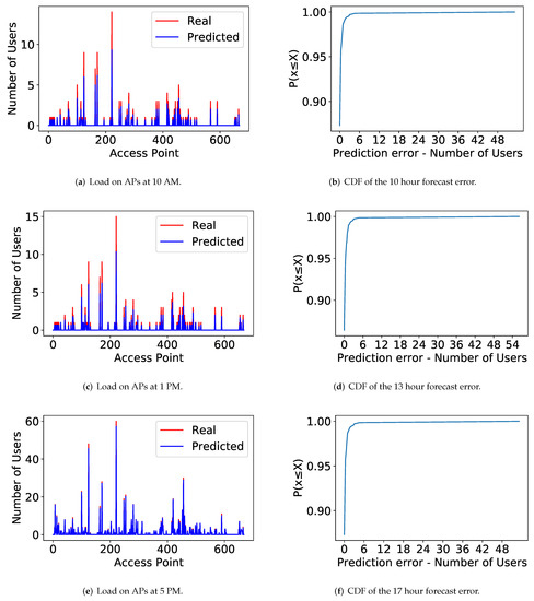 Considering the proposed strategy, in this paper, we deploy a virtual server on Amazon AWS with 32 GB of RAM to process all the traffic matrices of the academic network. Table 1 shows experiment characteristics. The load analysis on each network’s access points is carried out at fixed intervals, every 10 min, in which the association of each user to the APs in the network is evaluated. Figure 2 shows that the proposed model, based on first-order Markov chains, estimates the expected load on each access point with good predictive accuracy, achieving 90% assertiveness for all access points. Figure 2a,c,e present, respectively, the results obtained for the data collected at 10 AM, 1 PM and 5 PM for all access points. There is a large overlap between the values for predicted load and actual load for all access points, indicating that the prediction is assertive. It is worth noting that each time of day presents different load behaviors, with different numbers of users. To statistically evaluate the model assertiveness, Figure 2b,d,f show the cumulative distribution function for the model’s forecasting errors for each hour of the day represented. Regardless of the usage pattern for each hour of the day, the proposed model is accurate for more than 90% of the Access Points in the network within a confidence interval of 90%.