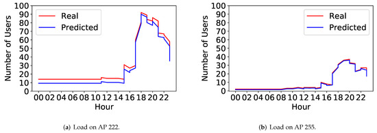 Figure 3 shows how the proposed model follows the actual access workload curve for two specific access points during the day. The chosen access points, AP 222 and AP 255, are critical in the network, as they are among the 20 most used in the entire network. AP 222 has the worst prediction, the greatest cumulative absolute error, and the highest use in the network among the access points. In contrast, AP 255 has the most accurate prediction, the smallest error. The comparison between the forecasted and the actual workload is shown in Figure 3a for the AP 222 and in Figure 3b for the AP 255. It is noteworthy that the model tends to predict access load with less assertiveness at the beginning of the network operation when there is less network traffic. As the number of flows in the network increases, the volume of data for analysis grows, improving model accuracy for both APs. Examples in Figure 2 ratify this conclusion, as the model precision is greater for the analysis at 5 PM in comparison to analysis in previous hours. The observation is consistent for all access points. This characteristic is favorable to the proposed model since the forecast accuracy increases with the number of associations to the network.