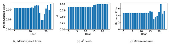 where represents the actual measured value, represents the predicted value, and is the average of the values. Figure 4b shows the results for the consolidated score for all access points. The results show that the model predicts more than 0.80 of workload variation at the access points throughout the day. The result also confirms that the model’s precision increases at times of greater use of the network. Finally, Figure 4 shows the maximum error between the forecast and the current load of the access points throughout the day. It turns out that the maximum error is limited to five users per access point for most of the day. However, the maximum error, approximately seven users per access point, occurs when there is a discontinuity in the network load caused by the abrupt drop in network usage at the end of the day. It is a limitation of using Markovian models.