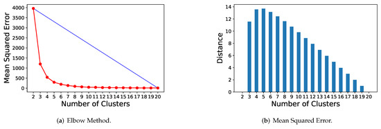 Besides the workload forecasting, the proposal also evaluates the users’ profiles. The proposal is based on the k-means Web-Scale algorithm to identify network users’ profiles. Figure 5a presents the comparison of the Mean Square Error for the distance between samples and the cluster centroid for clustering the dataset into 2 up to 20 clusters. According to the Elbow method, we conclude that the ideal number of clusters for the analyzed data is five groups. The Elbow method aims to identify the best balance between processing cost and data modeling quality, determining when the gain is no longer significant to add one more cluster. The Elbow method consists in drawing a straight support line connecting the two ends of the error curve by the number of clusters, in blue, and calculate the distance between the Mean Square Error curve for a given number of groups and the straight support line in blue [25,26]. The best number of clusters is the one that presents the most significant distance between the point in the Mean Square Error curve and the support line. Figure 5b shows the comparison between the distance of errors per number of groups and the support line. The algorithm’s configuration that presented the best performance is the one with five clusters. At this point, there is an inversion in the error growth trend, indicating the best trade-off between the number of clusters and processing. Therefore, five user profiles are considered in the analyzed network. In this way, it is possible to quickly apply to each new flow reported by NetFlow, the clustering model of network flows for user’ profiles and, thus, determine the workload pattern that best applies to the users on an access point.