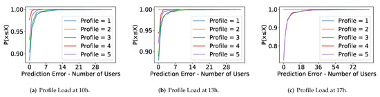 Using the data enriched by the users’ profiles, it is possible to execute the proposed strategy and forecast the workload at each access point according to the users’ profiles. Figure 6 shows the cumulative probability distributions of forecast errors for each of the profiles at three times of the day: 10 AM, shown in Figure 6a, 1 PM in Figure 6b and 5 PM in Figure 6c. The results reveal that the workload prediction based on profiles is accurate for all profiles since the number of errors is less than five for more than 90% of the cases evaluated.