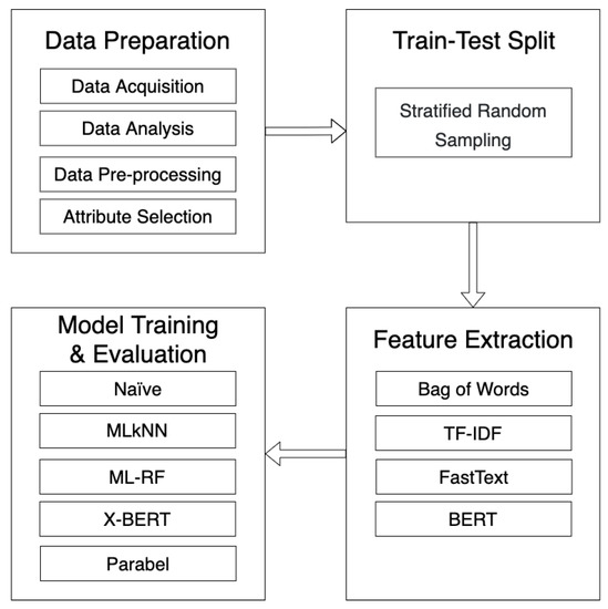 We consider the task of Multi-label text classification in the domain of social sciences by using the FSD data. We summarize the workflow of our task into four stages: Dataset Preparation, Train-Test Split, Feature Extraction and Model Training & Evaluation. In Figure 1, we provide a diagram illustrating the pipeline of our task. Each box illustrates the respective technique that was used during the corresponding stage.