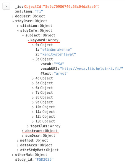 The studies in the FSD archive are structured according to the Data Documentation Initiative standard and represented using the XML (Extensible Markup Language) format. Each study’s metadata consists of a subset of defined study-attributes that include the title, the abstract and a variable-length set of manually assigned labels which describe the study’s scope. In Figure 2, we provide an illustration of the metadata structure for an example study.