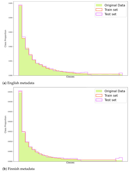 The sorted label distributions on the train and test data sets for the English and Finnish studies’ metadata. The labels are sorted along the horizontal axis, based on their occurrences in the original data. The vertical axis represents the relative class proportion of each respective label.