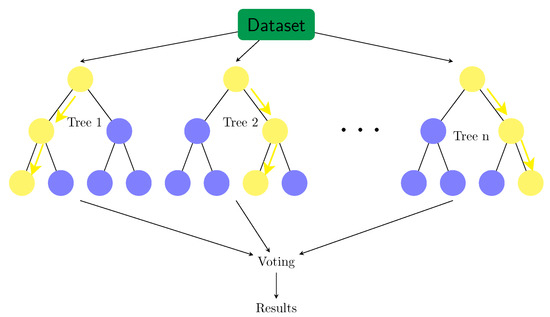 The RF algorithm consists of extracting n equally sized sub-samples from the dataset where n corresponds to the number of decision trees that comprise the model. On a random forest, the decision tree models are constrained to select optimum splitting points out of a random subset of features. Using these two constraints, RF imposes an inter-tree diversity, making it a robust machine learning model. The output of a random forest model is obtained through averaging the individual outputs of all the n decision trees, a process known as voting. Figure 5 provides a diagram of the prediction process that takes place on the Random Forest algorithm. The RF algorithm has been modified and applied to the MLC tasks [30,31]. Such models are not able to learn from any dependencies within the labels and are expensive in terms of space and time during training and evaluation [29].