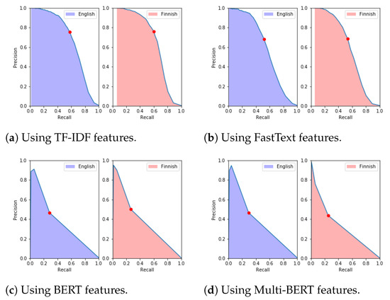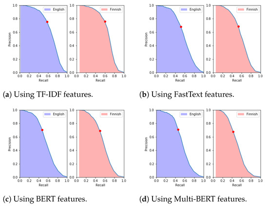 We evaluated the selected models combined with the feature extraction methods on the English and Finnish testing datasets. Besides the Naive method which gives its predictions in a vector of 0-1 integers, all the approaches we selected can provide a probability distribution for the target labels i.e., where M is the model providing the predictions and s is the target study. Deciding whether to assign a label to a study given the predicted probability distribution can be solved by arbitrarily selecting a threshold value. The labels with the corresponding probability value greater than or equal to the threshold are assigned to the target study. With a threshold t = 0.3, the previous example would be converted to Selecting the threshold value results in a tradeoff between the precision and recall score. We tested 100 different threshold values spaced equally within the range [0, 1] for every combination of our selected models with the feature representation methods and plot the precision-recall curves, respectively.