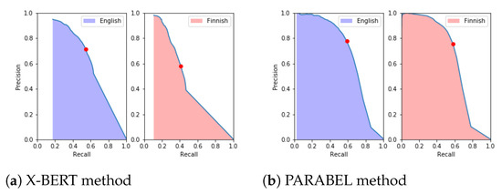 We plot the precision-recall curves for the predictions obtained from X-BERT and PARABEL in Figure 8. There are minor differences between the predictions obtained for each language. The predictions of PARABEL method provide a higher recall on average which explain the wider distribution of the area under the plot along the recall score axis.