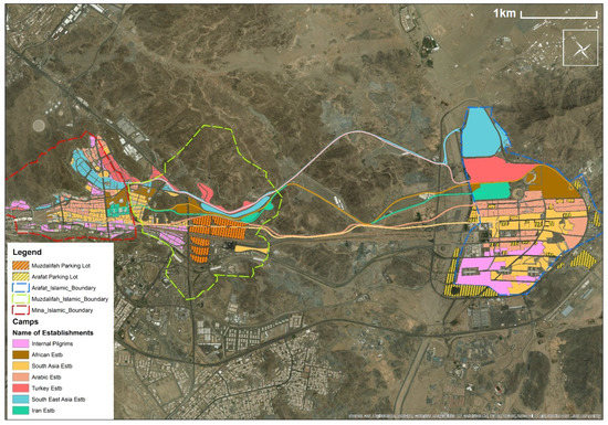 Map-based distribution of Establishments in Mashaer area (Mina, Muzdalifah and Arafat), their assigned routes.