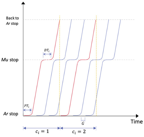To break down the problem into pieces, let us consider one Establishment in Arafat and Muzdalifah and index its offices as with a total of pilgrims waiting for shuttle buses at the Arafat office stop i. Let us further assume that the Establishment is limited in resources as it only has N buses in total, with a capacity of seats per bus. Since this is a shuttle service, it is anticipated that each bus will serve more than one cycle at one office to discharge all its pilgrims to Muzdalifah. Let us define the length of one cycle at office i, denoted by , as the time between the departure and return of the first bus in the service from and to the office in Arafat, marked with the first red line in Figure 2. can be estimated by (1) from the average pick-up time at the office i in Arafat, denoted by ; the average travel time on the link between Arafat and Muzdalifah, denoted by ; the average drop-off time at office i in Muzdalifah, denoted by ; and the average travel time on the returning link between Muzdalifah and Arafat, denoted by . Figure 3 illustrates the proposed service configuration.