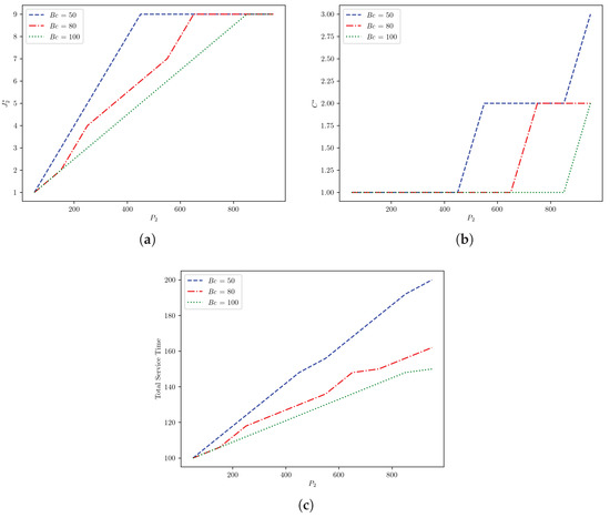 We conducted a sensitivity analysis to gain insight into the model outcomes with the variation of the model parameters. Such analysis can help in future improvement planning of the service operation. In this analysis, we varied the values of the model parameters (e.g., , , , etc.) and observed potential patterns in the model optimal outcomes (i.e., , and ). For example, one can consider large-size-seat buses to save the office service time as shown in Figure 4c or a small time gap G between buses to achieve large bus capacity in the office as in Figure 5a, or manage the pick-up time in the office to maintain high bus capacity and low service time as seen in Figure 6. Overall, we considered three sets of sensitivity analysis with offices using Python as follows: (1) vary with a set of ; (2) vary with a set of G; and (3) vary with a set of . In all sets of analysis, we set N to 50 buses, and and to 20 min and investigated the impact of various parameters on , and .
