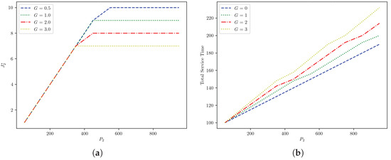 In the second analysis, we investigated the tendency of improvement of the model output by altering G at different levels of . In this analysis, we set the parameters of offices 1 and 2 similar to those in the previous analysis, but we fixed at 50 seats and varied G as 0.5, 1, 2, and 3 min. Results in Figure 5a show that the actual impact of G is noticed as an increase in the capacity of buses in the office when it is overcrowded with pilgrims, and its buses run more than one cycle. For example, setting min instead of min between two buses increases the capacity of buses at the office from to buses. In terms of the office , Figure 5b shows that lowering G from 1 to 0.5 min reduces from 200 to 190 min.