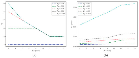 In the last analysis, we intended to observe possible improvement on ST and changes on through diversification of at different levels of . We set the parameters of the offices as 1 and 2, and the Establishment as pilgrims, min, min, seats, and min. At the same time, we set the variables for the office 2 as pilgrims and min. Figure 6a shows how a dwell time like 11 min can disable the effects of in improving the service, and further cuts down the capacity to buses. Thus, a lower value of is encouraged (such as 7 min) to improve the office bus capacity, resulting in buses for pilgrims and for pilgrims. Figure 6b demonstrates how is sensitive to at different degrees of . The figure shows that, at any , the increase of increases in general, and the rate change of this increase depends on the size of . This can be seen when changing of in Figure 6 from 5 to 13 min with and pilgrims. With the prior pilgrim demand, the office ST increases 220 − 160 = 60 min only compare to 550 − 310 = 240 min with the later demand.