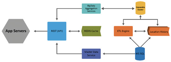 The data migration platform is classified into data lake layer, big data layer, REDIS cache, REST API and App Servers. The data lake layer contains the actual data that we received from the car syndicate authority, Ministry of Hajj and Umrah, Saudi Arabia. The original data that we received from the authority is in Microsoft SQL Server. The master data service contains all the relations of the table that we need to illustrate based on conditions such as company 1 and 2, or bus identifier. Big data layers use the Cassandra cluster to store location history data employing the Extract Transform and Load (ETL) engine to increase the efficiency, whereas data aggregation service is a combination of Hadoop and Presto for batch-based analytics. REDIS is used as a cache to store keys and value pairs to provide high performance. REST API contains the number of APIs to handle the request of the Application server and returns the response to be visualized in the front-end of the app server.
