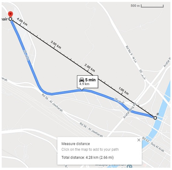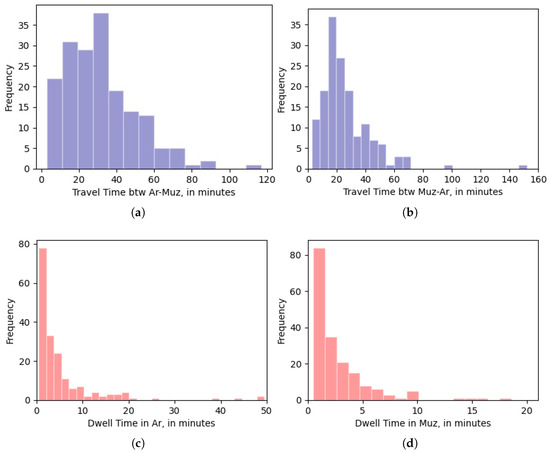 To evaluate the model in (6) with the African Non Arab Countries Establishment, we first need to extract the model inputs (i.e., , , , and ) from the migrated-and-enriched data, for each office. Due to the absence of determinants of the state of the bus on its journey between Arafat and Muzdalifah in the Naqaba data—which represented the model inputs —we encountered some difficulty in defining an automatic approach for extracting the spatiotemporal data of buses based on their states. Therefore, we collected these data manually from 41 randomly selected buses—one from each office. Our low sampling is because extracting the bus states by tracking it every 0.5 min on a map requires significant time and effort; often, multiple hours per bus. However, the issue with such a sample is that it cannot statistically represent the average of bus state per office. As a workaround, we decided to deem a single average for all offices in each bus-journey-state, as can be seen in each column in Table 2. The distributions of , , , and from the manually extracted data for all offices are shown respectively in Figure 10a–d and their average values, used in the model evaluation, in Table 2. The Establishment shuttle bus service identified path is shown in Figure 9.