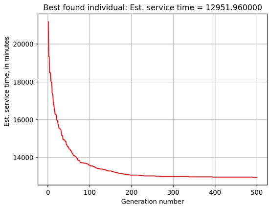 The required model inputs (i.e., , , , , , , and G) for the evaluation of the African Non Arab Countries Establishment shuttle bus service were set as in Table 2. was set to 50 seats and G to 30 s to maintain a service time that is as close as possible to 7.5 h, reported by the Naqaba in Hajj 2018. The GA, with the setting given in Section 3.3, was used to solve the problem of transporting a total of 139,145 pilgrims from offices in Arafat to Muzdalifah with the and needed at the offices that minimize the Establishment overall service time. The convergence of the evaluated model service time to the minimum time is shown in Figure 11. The last two columns in Table 2 show the and for the first three offices in the Establishment. The minimal service time, or the quickest possible evacuation time, at the Establishment can be achieved in 7 h and 9 min. This value can be reduced if the extracted dwell times, and , are managed by the office operators. A reduction of to 7 min, for example, can expedite the service time at the Establishment, bringing it to 6.2 h.