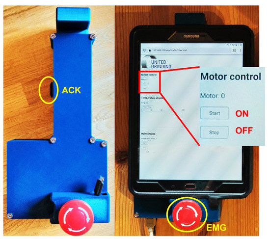 - Step 2: Following a successful authentication in Step 1, full administrative access is granted to the web-based HMI. Using the touchscreen of the tablet, the user can perform the following operations on the industrial motor: (1) ON (2) OFF (3) ACK (Acknowledge) (4) EMG (Emergency), as shown in the communication system layout in Figure 4.