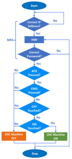 - Multi-factor authentication including an administrative password and the IP address of the industrial machine to control access to the web-based ubiquitous HMI of the proposed PoC, to avert potential cyber attacks or threats that are often associated with wireless communication systems such as IIoT systems;
