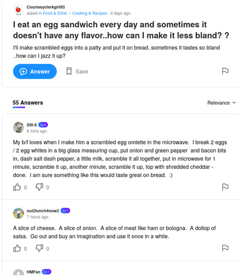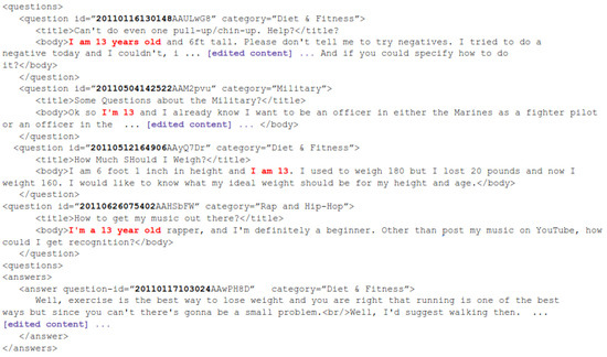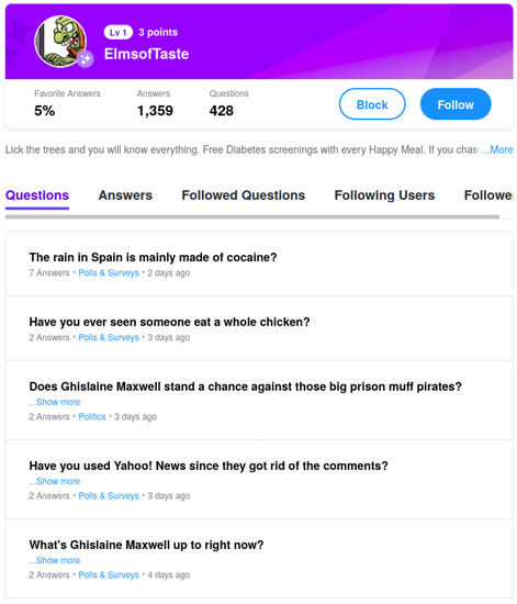 In order to fetch user profiles (see Figure 1) and question-answers pages (see Figure 2) from Yahoo! Answers, we took advantage of the web scraper implemented in [28], which ran for around three years (September 2015–2018). As a result, about 53 million of question-answers pages were retrieved, wherefrom all question titles, bodies and answers were extracted accordingly; and in the same manner, ca. 12 million profile pages were downloaded. From these pages, we extracted self-descriptions, images and lists of questions. We then singled out all textual content written predominantly in English by means of a language detector (https://code.google.com/archive/p/language-detection/ (accessed on 1 February 2021)). See a sample record in Figure 3.