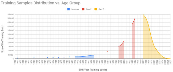 Table 1 gives an intuition about the age distribution observed within our corpus across both modalities (i.e., texts/metadata and images). As a means of facilitating this comparison, samples were grouped by following the theory of William Strauss and Neil Howe [29]. This is premised on the proposition that each generation belongs to one of four classes, and that these classes repeat sequentially in a fixed pattern. By virtue of these descriptors, five distinct cohorts were identified: Matures, Baby Boomers, Generation X-ers, Millennials/Gen Y-ers and iGen/Gen Z-ers (https://www.kasasa.com/articles/generations/gen-x-gen-y-gen-z (accessed on 1 February 2021)). It is worth mentioning there that people born earlier than 1944 became members of the additional cluster "Matures."