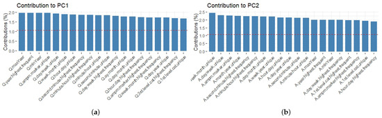 Contributions to the first (PC1) (a) and second (PC2) (b) components by the 20 most significant variables. The red line represents the threshold for the significant variables (see variable descriptors on Appendix A).