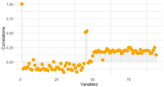 Furthermore, correlation analysis unveils that age (year of birth) is more correlated with variables distilled from questions than from answers. To be more precise, Figure 8 highlights their Pearson correlation coefficients. From these results, we can conclude that question variables (from 51 to 94 ) seem to be better age predictors than their counterparts extracted from answers (from 2 to 44). The first correlation equal to one indicates that the correlation of the first variable is with itself. However, the highest correlations are with variables 45 and 46; those are the years that the members started and ended their activities, respectively. Additionally, from Figure 8, it emerges that answers are negatively correlated with the year of birth, while questions are positively correlated.