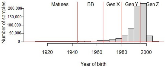 The methodology of analysis consisted of four different steps: (1) we cleared the data by detecting and eliminating anomalous values; (2) as a means of reducing the number of dimensions, we applied principal component analysis (PCA) for identifying the subset that largely contributed to the total variability; (3) we applied a correlation function for determining the groups of variables that exhibited the highest correlations with the different age cohorts; and finally, (4) we implemented random forest classifiers to distinguish between the two youngest age clusters (i.e., GenZ and GenY). As a result, we discovered the most informative variables.