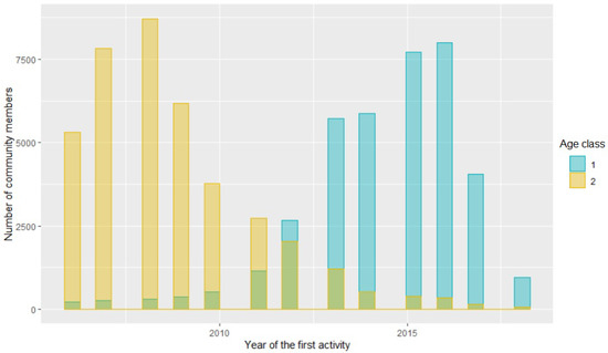 If we observe the histogram plot corresponding to the top selected variable (considering samples), that is to say the element denoting the year when a community member starts his/her activity in the site, we find a different behavior for Gen Z (class 1) with respect to Gen Y (class 2), which allows one to improve the classification rate (see Figure 10).