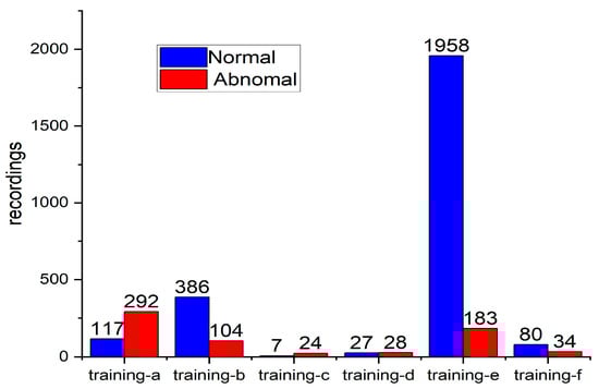 From Figure 1, the number of records of normal and abnormal signals in these databases is very unbalanced, and the imbalance in the samples in the training-e set is the most significant. We therefore used a weighted loss function in feature training to balance our positive and negative samples, making our results more reliable, which will be introduced in more detail in the feature classification section. In addition, because this database was prepared for a competition, the training set data were the only data we had access to, and the test set data were used as a hidden dataset to compile the official test score. Hence, this experiment was conducted on the public training dataset.
