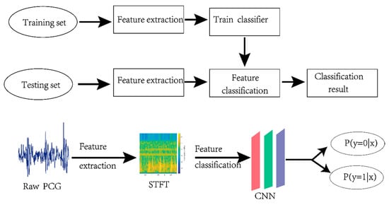 According to statistics from the World Health Organization, cardiovascular disease has become one of the leading causes of death in the world [1]. Effective monitoring and testing methods can increase the number of groups screened and therefore reduce mortality. The first step in evaluating cardiovascular disease in clinical practice is a physical examination. Auscultation of heart sounds is an important part of the physical examination. During the cardiac cycle, the heart undergoes electrical stimulation, and the formation of atrial and ventricular contractions leads to mechanical activity. This mechanical activity, as well as the sudden starting or stopping of blood flow in the heart, will cause the entire heart structure to vibrate. These vibrations can be heard on the chest wall, and specific heart sounds can give an indication of heart health [2]. As an important initial screening method, heart sound diagnosis can uncover many pathological heart diseases, such as heart rate failure, valvular disease, heart failure, and so on [2,3]. However, traditional heart sound auscultation methods are highly dependent on the experience of the doctor. Only doctors with many years of experience can accurately diagnose whether a patient may have heart disease with this method. Hence, auscultation is not suitable for situations where there are limited medical resources and a large patient population, such as occurs in general practice. Therefore, it is necessary to investigate a method for automatically classifying heart sounds that can be applied to develop a portable low-power automatic monitoring device.