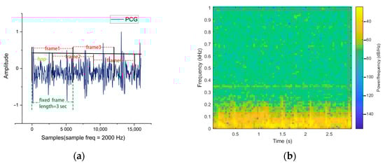 Segmentation of the heart sound signal and a time-frequency diagram of a 3 s segment. (a) Asynchronous segmentation example with a length of 3 s where the hop size was 1.5 s. (b) Time-frequency diagram of the heart sound signal of 3 s.