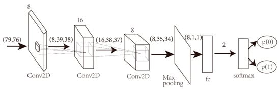 As shown in Figure 4, a three-layer two-dimensional CNN network for feature learning and classification was adopted firstly. The size of the input to the two-dimensional-feature model was 79 76. Then, filters were used to extract the features of each layer, and the maximum pooling was used to reduce the parameters of the subsequent fully-connected layer and realize adaptability to different sizes of the input matrix. Finally, through the SoftMax layer, the probabilities of predictions of 1 and 0 were obtained, among which the higher probability was the prediction category of the sample.