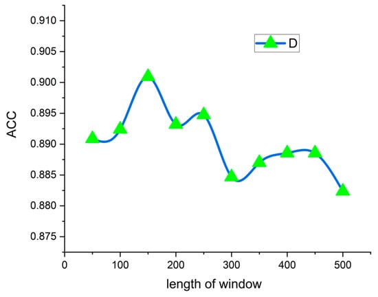 STFTs with different window lengths have different resolutions in the time domain and frequency domain. In order to obtain a relatively high accuracy rate, in the course of the experiment, we carried out multiple experiments on different window lengths. We found that, when the window length was 150 and the overlap rate was 50%, the ACC of the classification result was the highest, as shown in Figure 5.