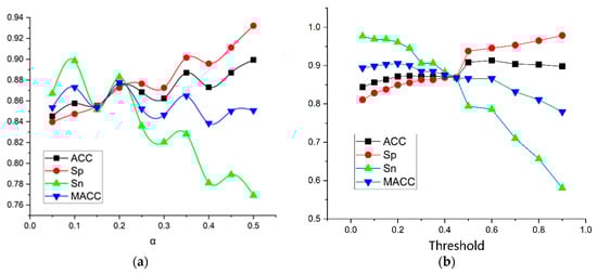 In the training process, to balance Sn and Sp as much as possible, we set different classification weights through the loss function to solve the classification imbalance and improve the MACC of the classifier. We set the classification weight and the threshold to different values, which varied from 0.1 to 0.5, and trained the model with the prepared training and validation sets. The optimal parameters of the validation set were used for the parameters of the final model, and the corresponding test results were obtained. We also tested the impact of different classification thresholds on the results, as shown in Figure 6.