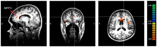 Significant activity in the MPFC (medial prefrontal cortex) during the anticipation of choice of SHPs (second-hand products) compared to new products ((left) Sagittal slice; (center) Coronal slice; (right) Horizontal slice).