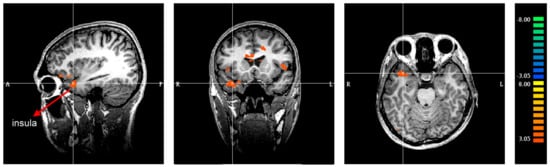 Significant activity in the right insula during the anticipation of choice of SHPs compared to new products ((left) Sagittal slice; (center) Coronal slice; (right) Horizontal slice).