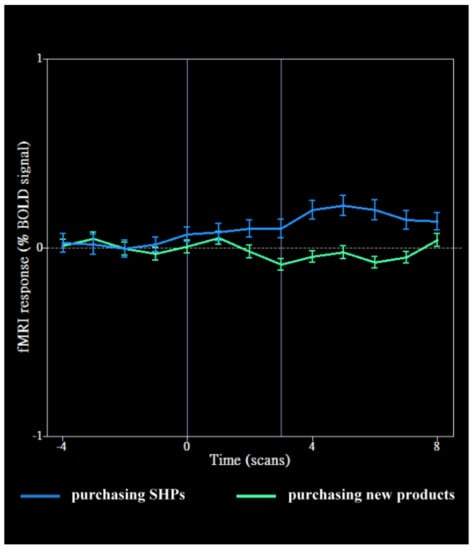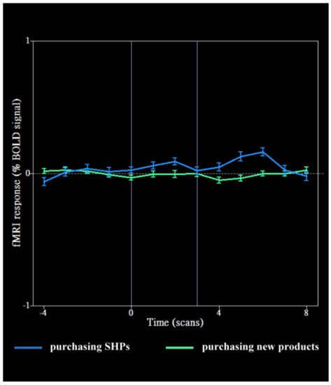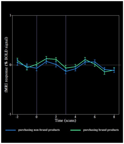 An fMRI scanner, GE MR750 (GE Healthcare, Chicago, IL, USA), scanned and collected the structural and functional images of the participants’ brains. The scans’ parameters were the default settings provided by the manufacturer. BrainVoyager QX (Brain Innovation B.V., Maastricht, The Netherlands), a software package for the analysis and visualization of brain images, provided the dataset for analyzing the fMRI output. The fMRI analysis methods used were data pre-processing and general linear model (GLM). The data pre-processing method included slice-timing correction and 3D motion correction. Slice-timing correction applied a phase shift of the time-series, while 3D motion correction validates the fMRI data. The assumption is that the variations of intensity in the same voxel between repeated measurements of a time-series are primarily due to the changes in cerebral physiology. After pre-processing the fMRI data, seeking a fit between a GLM and the time series of each voxel is a common approach for identifying the voxel to which the time series significantly correlates with a specific experimental condition. The statistical threshold for denoting the activity of a specific brain area was set to p < 0.01, while the cluster threshold was set at 10 continuous voxels [31]. ANOVA and chi-square test were performed using SPSS v17.0. The ANOVA compared the BOLD time course of a certain brain area under different experimental conditions. The chi-square test determined whether a significant difference existed in the number of purchasing decisions for SHPs and new product versus that of non-purchasing decisions for SHPs and new products (i.e., runs 1, 2, 5, 6). A chi-square test was also conducted in the scenarios regarding brand-name versus brand-less SHPs and new product purchasing decisions (i.e., runs 3, 4).