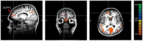 Significant activity in the DLPFC (dorsolateral prefrontal cortex) during anticipation of choosing brand-name products compared to brand-less products ((left) Sagittal slice; (center) Coronal slice; (right) Horizontal slice).