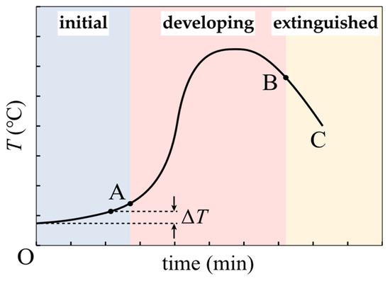 Fire detection time is relevant to the warning algorithm and the fire growth rate. The process of indoor fire development is divided into three stages: initial stage, developing stage and extinguished stage, as shown in Figure 1.