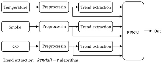 An architecture was created for fire early warning as shown in Figure 2. It determines whether there is a fire through fusing the data of temperature, smoke concentration, CO and their trend values. Firstly, the data collected by sensors is inevitably affected by environmental noise, so data preprocessing is necessary, such as filtering and sampling. Then, the improved algorithm is used to extract the trend values of preprocessed data. Finally, the data of temperature, smoke concentration, CO after filtering and the trend values are fed to the inputs of the BP neural network. The outputs of the BP neural network are the probability of flaming, smoldering and no fire in the current environment.