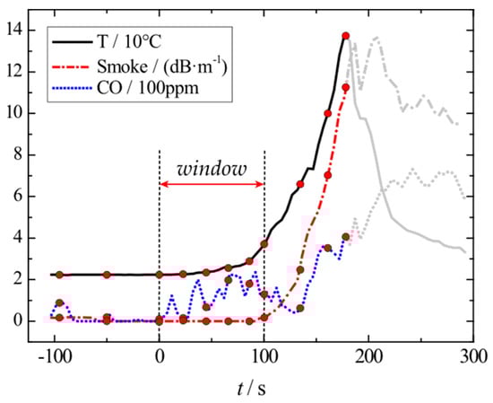 The data of fire parameters were obtained by sampling the continuous time signals. The trending algorithm was used to extract the trend values of fire parameters in this study. The trending algorithm is the most common and easy to implement of the trending algorithms [23]. Adding 0 or 1 is the only computation required, while the amount of calculation can be reduced by recursive algorithms. This makes it suitable for terminal devices with limited resources. It is worth noting that the correlation between changes of different fire parameters was not considered in this study. The trend values of temperature, smoke concentration and CO were separately extracted by the trending algorithm.