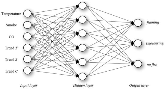 The model of the BP neural network is shown in Figure 4; the inputs are values and trends of temperature, smoke concentration and CO, and the outputs are the probability of flaming, smoldering and no fire. The first three fire parameter data at the input of the BPNN are the values at the current moment, and the last three trend values are related to the values at the previous moment. The time window for trend extraction is 20 s, so BP neural network estimates the output based on the fire parameters within 20 s of the input.