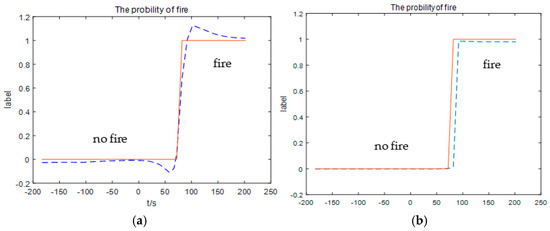 The reason for the reduction of the mean square error is that the addition of trend factors enhances the ability of the BPNN to distinguish between fire signals and environmental disturbances. The reduction of mean square error is beneficial to the improvement of the performance of fire detection. Figure 6a,b shows the training results of SDC05 based on the algorithms of the BPNN and Trend_BPNN, respectively. In Figure 6, the blue dashed line is the value of outputs, and the solid yellow line is the expected value. By comparing the two plots, it can be seen that the transition from no fire to fire can be accelerated by adding trend factors. The fit errors between the values of outputs and expected values are smaller when the Trend_BPNN is used.