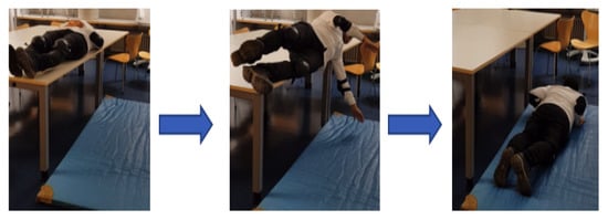 Each experiment lasted about a total of 40–45 min consisting of multiple sub-readings of 30 s each. A total of three falls was recorded in a single reading. In each fall, the subject was in resting position as shown in the Figure 2 for first 10 s. In the next 10 s, the volunteers would fall by rolling off the side of the table/bed and would lay on the ground until 30 s are completed. Then the subject would go up and repeat. A similar protocol was used by [34], a prominent dataset for falls and activities of daily life. The laying down or resting period after fall may indicate subconsciousness after fall and hence is necessary to include when designing a fall protocol mimicking elderly population. Some elderly people do not move after the fall. According to [35], a study conducted on 110 participants, of the 60% who fell, 80% were unable to get up after at least one fall and 30% had lain on the floor for an hour or more. According to [36], inactivity after the activity is a common basis for determination of a fall situation. Each reading consisted of 90 s containing a fall every 30 s. On average, 10 readings from each subject were collected.