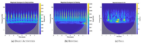 Figure 4a–c provide a comparison between falling and non-falling scalograms. It can be seen that scalogram with a fall in them have some areas with high energy concentration in them in yellow color. On the contrary, the energy seems to be distributed evenly in non-fall ECG scalogram representing the cardiac cycle. Then those images were divided randomly into training and validation data with 80% training images and 20% testing images.