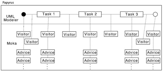 Moka is an event-based execution engine. At each event, a set of components will be queried in order to authorize or not the execution of a task. These components are called visitors and advices. In Moka, a visitor is instantiated at each element of the basic UML diagram: starting points, stopping points, transitions, steps, etc. Each of these visitors contains a list of advices associated with it. Each advice allows one to add an additional behavior to the execution engine. During simulation execution, each of the visitors will be consulted by Moka at the moment its own task is activated. When a visitor is consulted, all the advices associated with the visitor are executed in order to perform the behavior they describe.