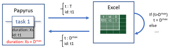 The task ID is transmitted to the Excel file via the ID field in the FailureProfile -> SiteExploitation. The HLAprofile is also applied to it, which points to the name of the federate to be executed -> Appro. As this task is subject to risks, Papyrus queries the environmental risk-management tool, in order to influence the input parameters of the JaamSim simulation. Parameters are calculated and then transmitted to the JaamSim federate by modifying the HLA object visible in Figure 12.